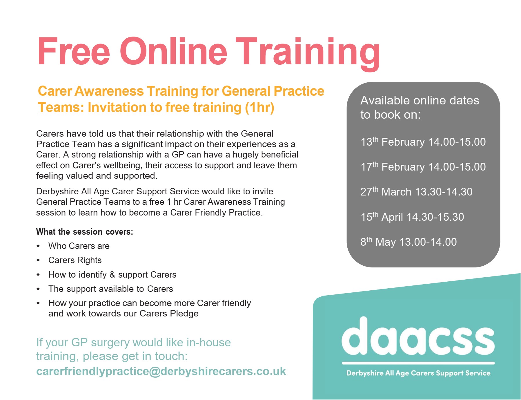 Derbyshire All Age Carers Support Service can offer ‘Carer Awareness Training’ to your GP Practice, so that all staff, or those who are public-facing, are more ‘carer aware’ and able to support & connect Carers with information and advice.